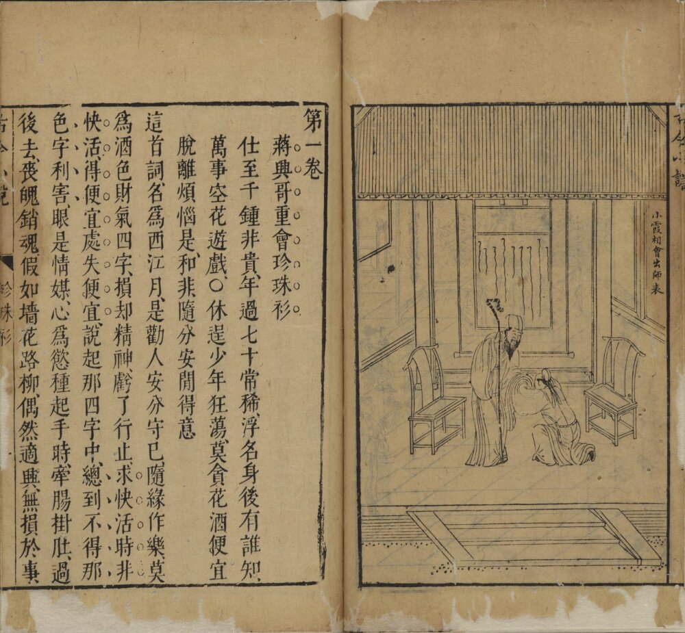 《古今小说》(喻世明言)是明末冯梦龙纂辑的白话短篇小说话本集。全书共四十卷,每卷一个短篇小说,始于:蒋兴哥重会珍珠衫。终于:沈小霞相会出师表。书前有版画三十七幅(对页)。此为日本法政大学图书馆藏明代刊本(缺卷二十四至二十九),有眉批。