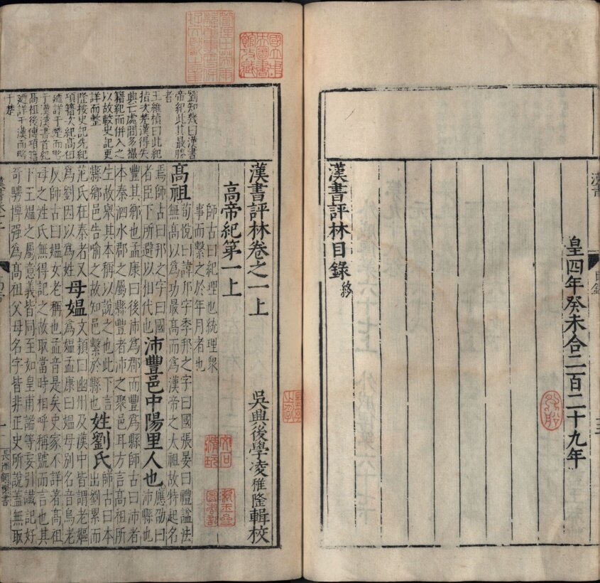 凡例(凌稚隆撰)、汉书评林姓氏、引用书目、字例、系图、汉书总评、汉书叙例、景祐刊误本、目录