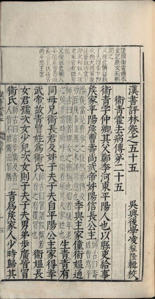 明万历时期凌稚隆在《史记评林》辑成之后,博搜群籍,并参考其父凌约言《汉书评抄》,收集各家对《汉书》的评点,撰成《汉书评林》。它汇集了东汉至明代 170 余家评论精粹,同时也蕴含着凌氏的个人见解,堪称有明一代《汉书》评点类书籍的集大成之作,为后世研究《汉书》提供有益的借鉴。