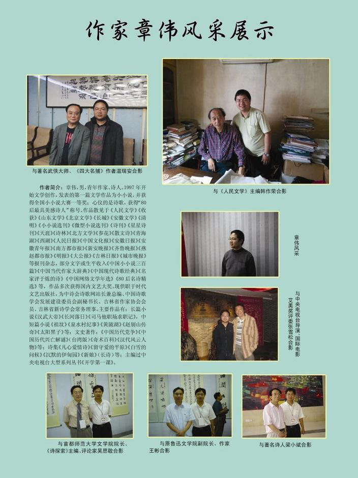 章伟,男,作家、诗人、编辑,1983年出生于安徽省庐江县,现居山东省淄博市。