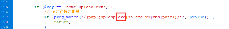 4、文件位置:/apps/admin/controller/system/ConfigController.php,大约在197行,找到|exe, 删除