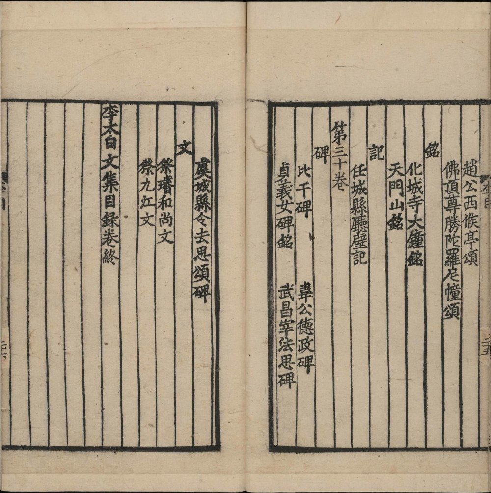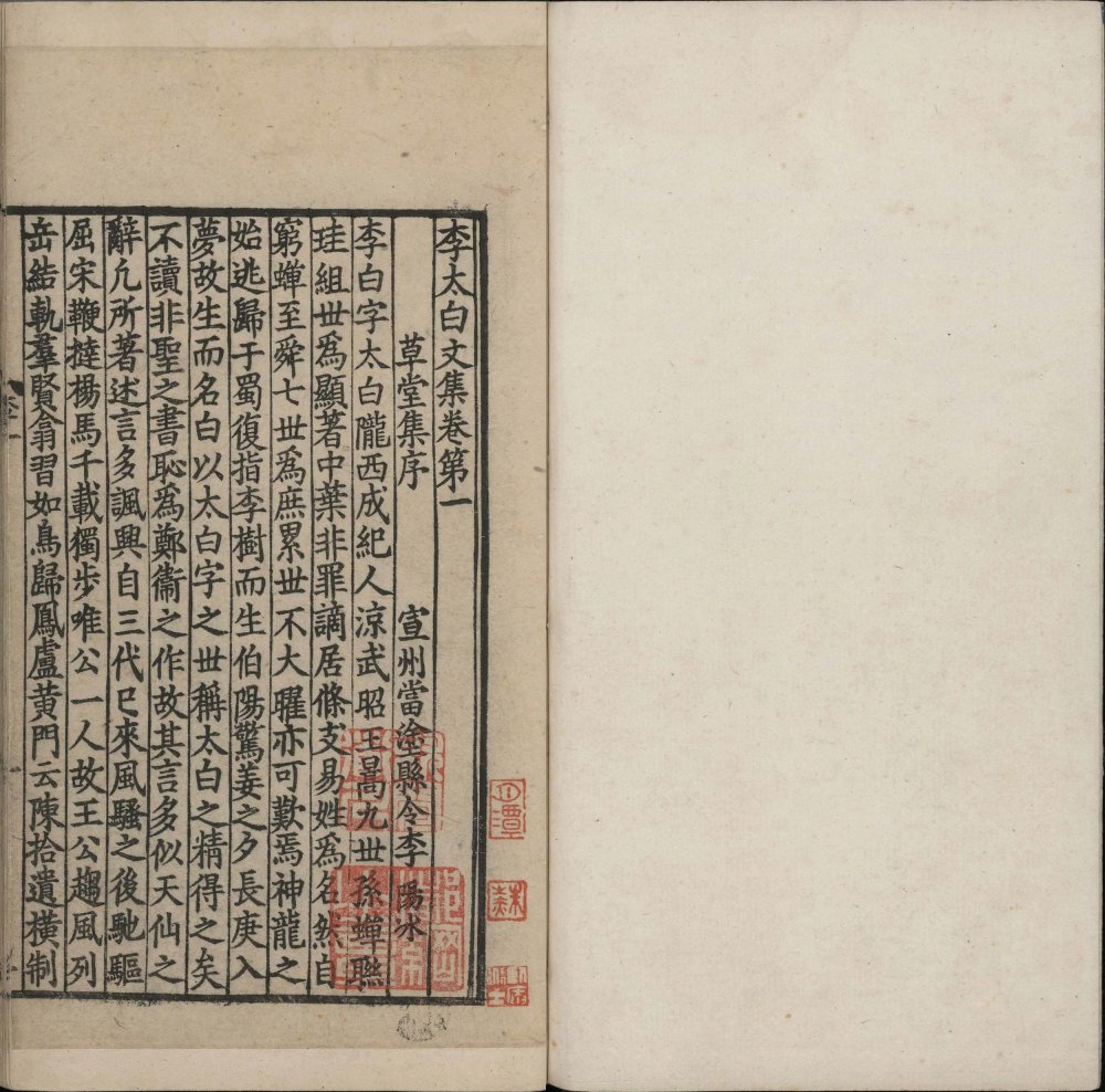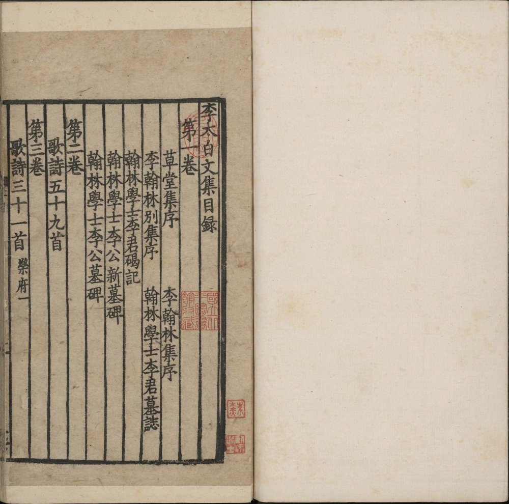 《李太白文集》由唐代李白撰。全书共三十卷,按文体编排:第一卷为旧集序文等;卷二至二十四卷为歌诗(分古风、乐府、歌吟等二十一类);卷二十五至三十卷为古赋、表书、序、赞、颂铭、记、碑文等。此为中国国家图书馆藏,南宋时期蜀刊本(卷十五至二十四配清康熙时期繆曰芑刻本)。