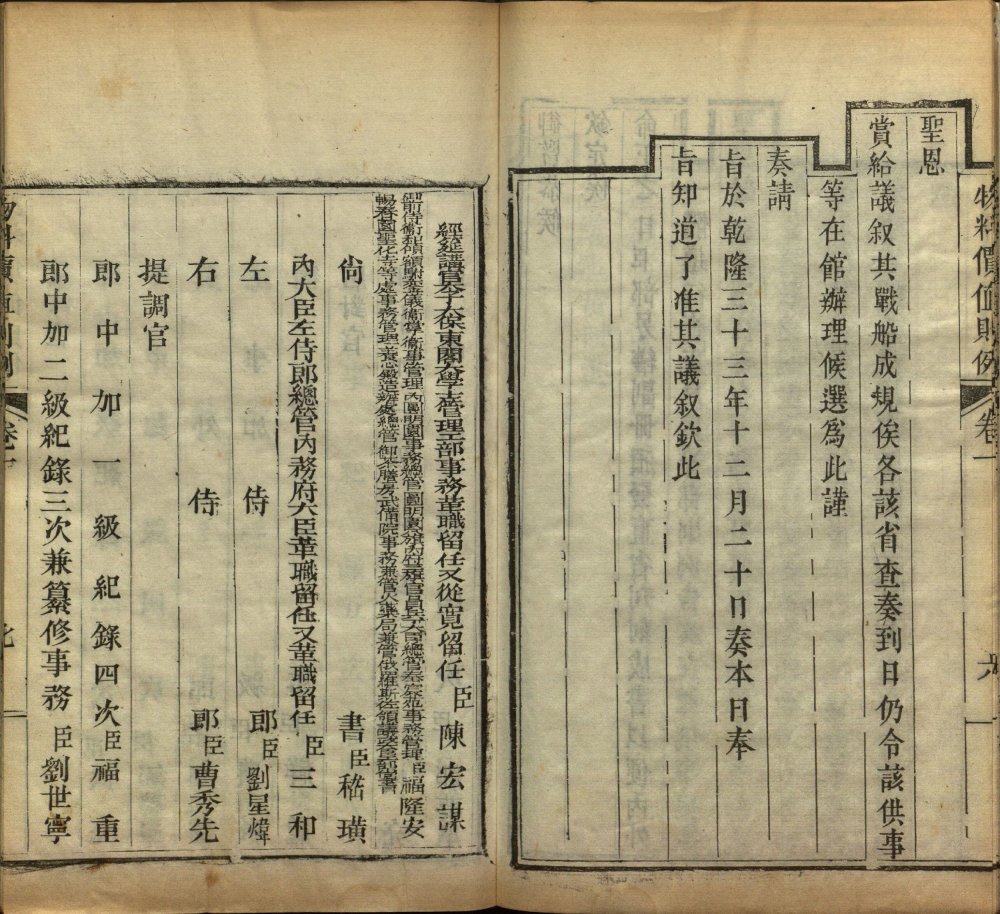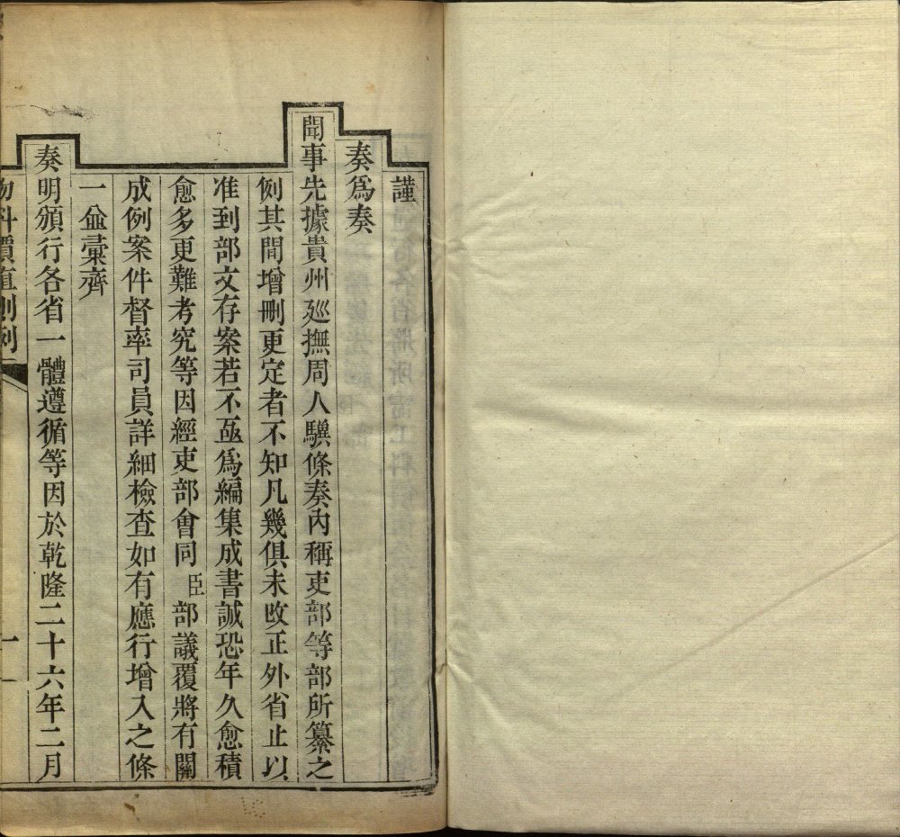 奏章、奏章、衔名、物料价值总略、凡例、目录 卷一:西安府 书前有有陈宏谋等清乾隆二十六年二月三日奏章、乾隆三十三年十二月二十日奏章,陈宏谋等衔名:陳宏謀、福隆安、嵇璜、三和、劉星煒、曹秀先,及提調官 2 人、纂修官 5 人、磨對官 9 人
