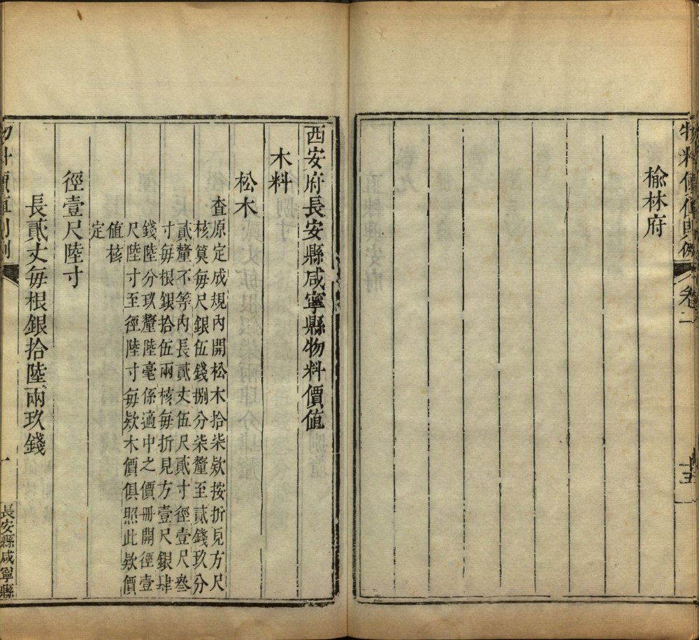 《钦定物料价值则例》(陕西省)由清代陈宏谋等奉敕編。全书共十二卷,列举西安府、直隶商州、同州府、直隶乾州、邠州、凤翔府、汉中府、兴安府、延安府、直隶鄜州、直隶绥德州、榆林府等地物料价格。所收款目有木料、石料、磚瓦、琉璃瓦料、灰土、顔料等。此为清乾隆三十三年工部刊本。