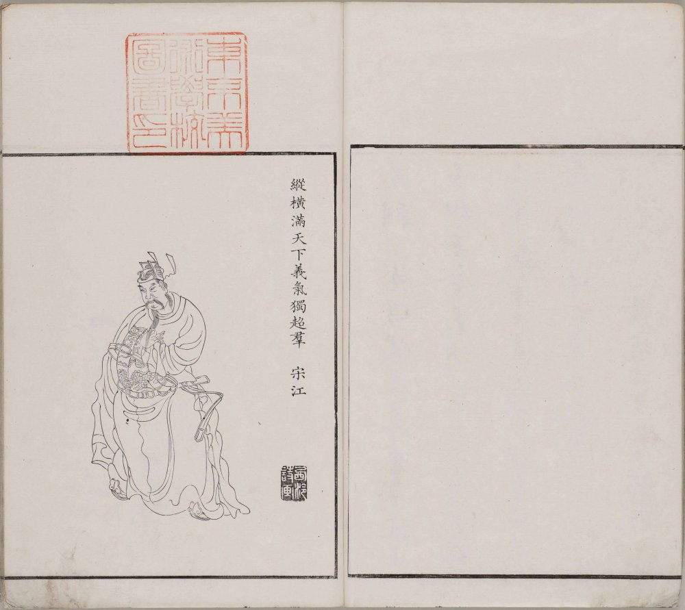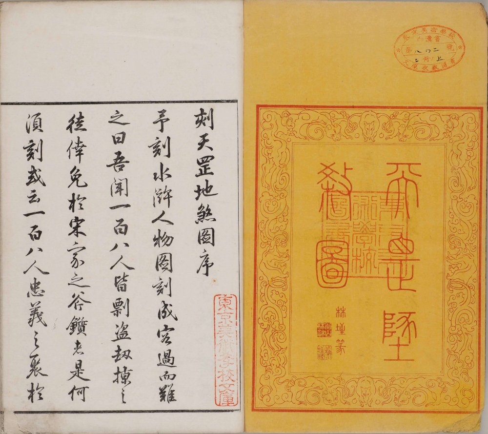 《天罡地煞图》由清代陆谦绘制,日本多胡真祇摹刻。其全书内容取材自《水浒传》一百单八将,白描绘制三十六天罡(始于:宋江、吴用、卢俊义,终于:解珍、解宝、燕青)七十二地煞(始于:朱武、黄信、孙立,终于:白胜、时迁、段景住)。此为日本天保六年至乐堂刊本。