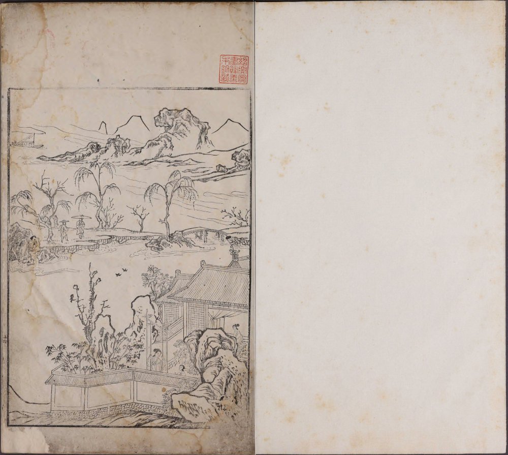 “诗馀” 也就是词。此《诗馀画谱》(又名《草堂诗馀意》)由明末宛陵汪氏辑。全不分卷,其内容撷取南宋《草堂诗馀》书中精粹的唐宋词百篇,请名家书翰,徽派名家摹刻历代名家作品为之配图,一词一图,相映成趣。此为绍兴图书馆藏明万历四十年宛陵汪氏刊本(残七十二幅)。