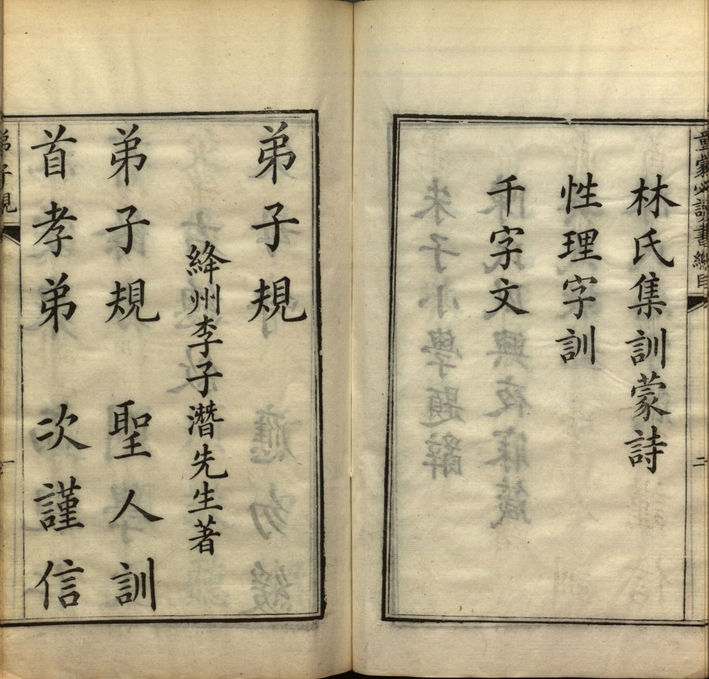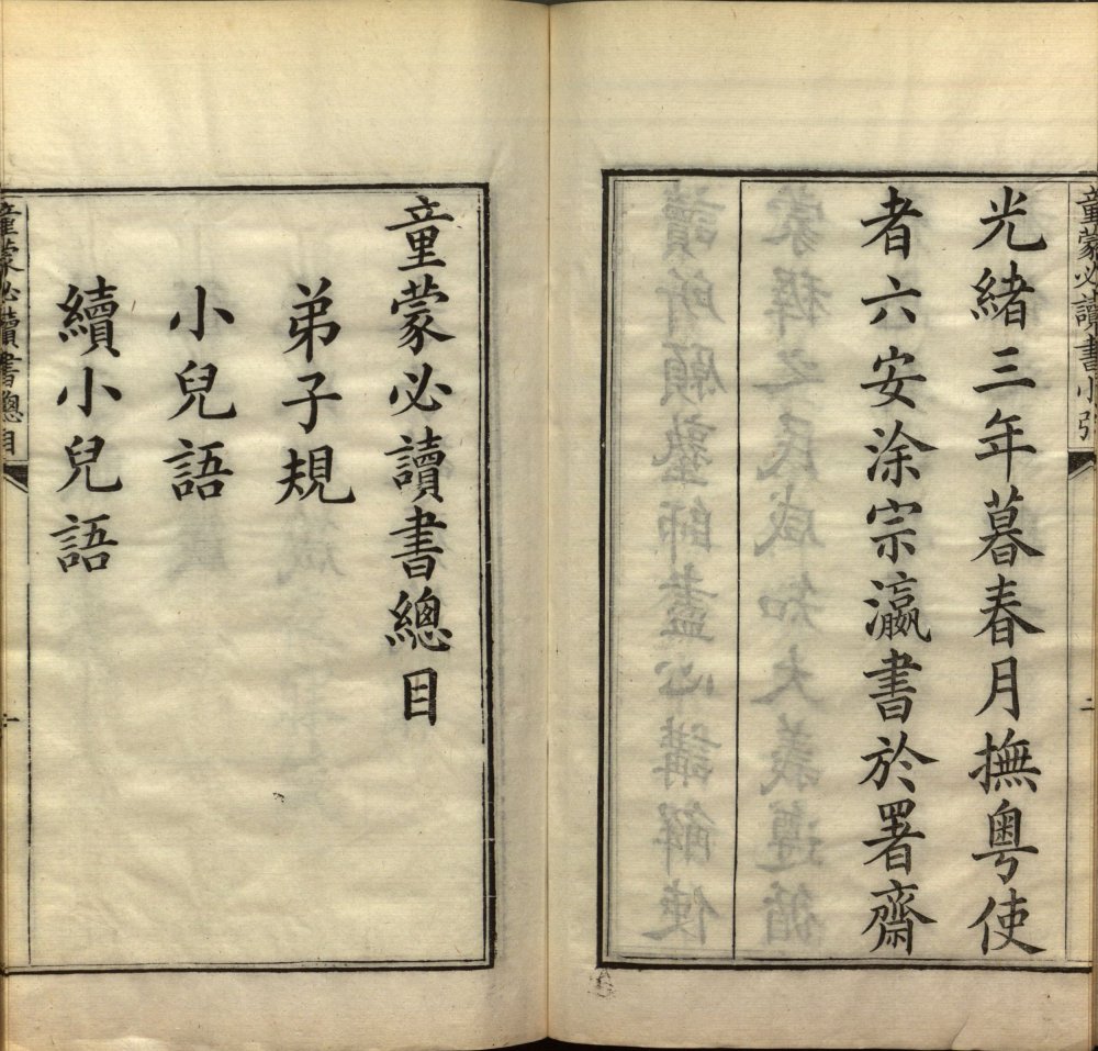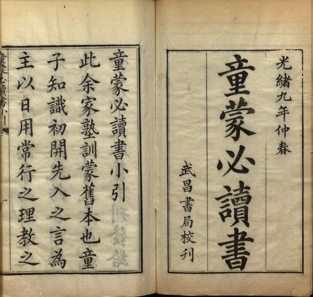 童蒙必讀書小引(涂宗瀛撰)、总目 弟子規(清 李毓秀 撰) 书名页题:光緒九年仲春 童蒙必讀書 武昌書局校刊 涂宗瀛(1811—1894)号朗轩,一号阆仙,安徽六安人,清朝政治人物。举人出身。 道光二十四年举人。开始担任知县,奉两江总督曾国藩令办理军粮,保授江宁知府。同治八年接替杜文澜任苏松道道员一职, 同治十年由沈秉成接任,转任湖南按察使、湖南布政使。光绪二年三月十五,由湖南布政使升任广西巡抚。