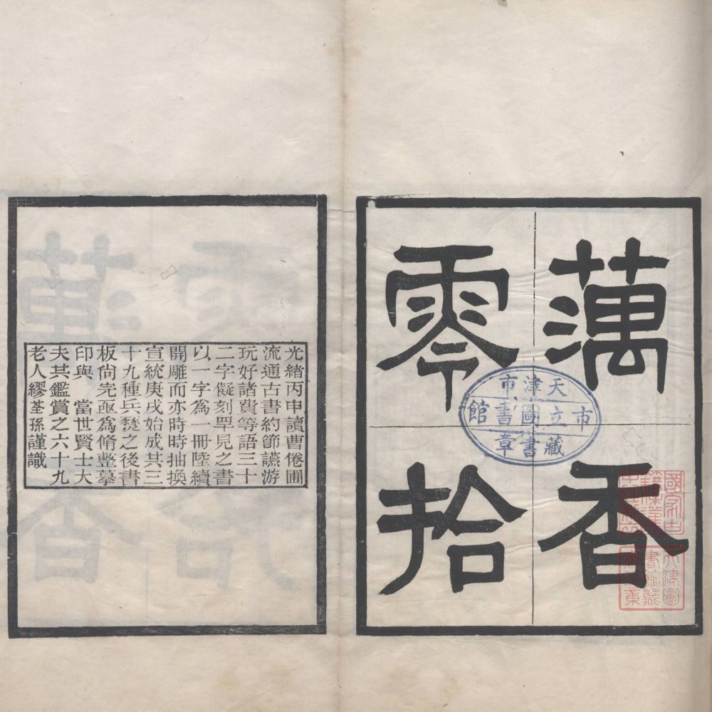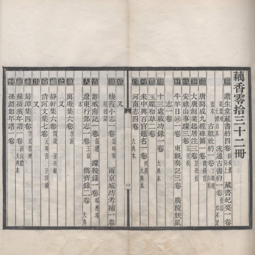 《藕香零拾》由清末民初缪荃孙编辑。全书共三十二册(收书三十九种)以明末藏书家曹溶《流通古书约》中的一段话为序,每字为一册。始于:澹生堂藏书约、藏书纪要。终于:破铁网、敬斋古今黈。这些书大多由编者亲自辑校并写有跋语或校勘记。此为清光绪至宣统时期刊本。