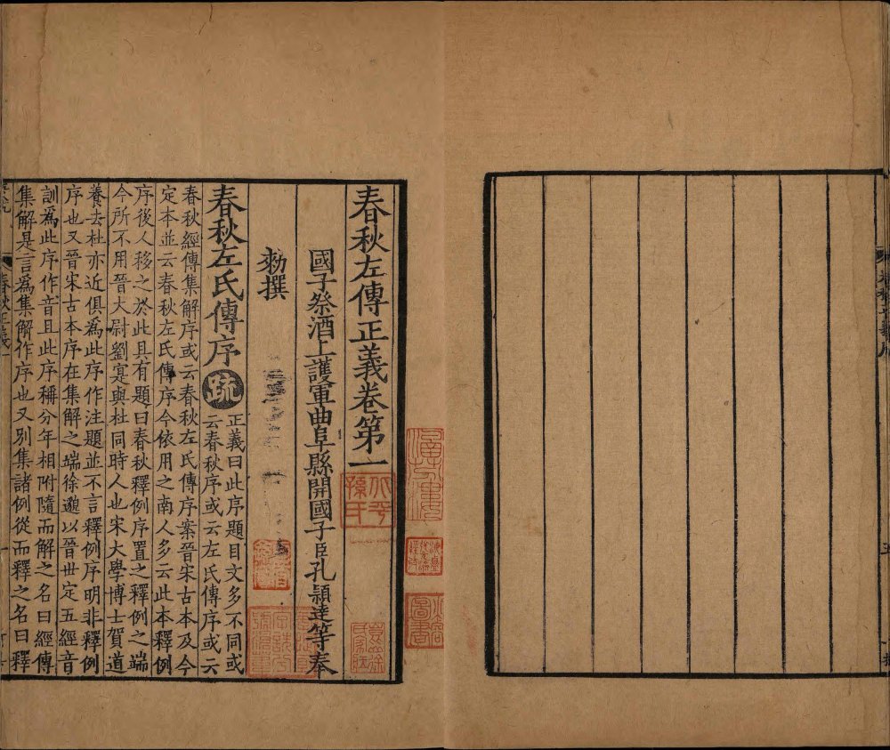 春秋正義序(孔颖达. 撰) 卷一:春秋左氏傳序 后序 卷前题:國子祭酒上護軍曲阜縣開國子臣孔穎達等奉敕撰 左丘明,相传为中国春秋末期鲁国的盲人史学家,为《左传》和《国语》的作者。《左传》为解释另一历史著作《春秋》的作品,战国时期成为儒家学派的经典之一。 杜预(222 年-285 年初)字元凯,京兆郡杜陵县(今陕西省西安市)人。魏晋时期大臣、军事家 、经学家、律学家。